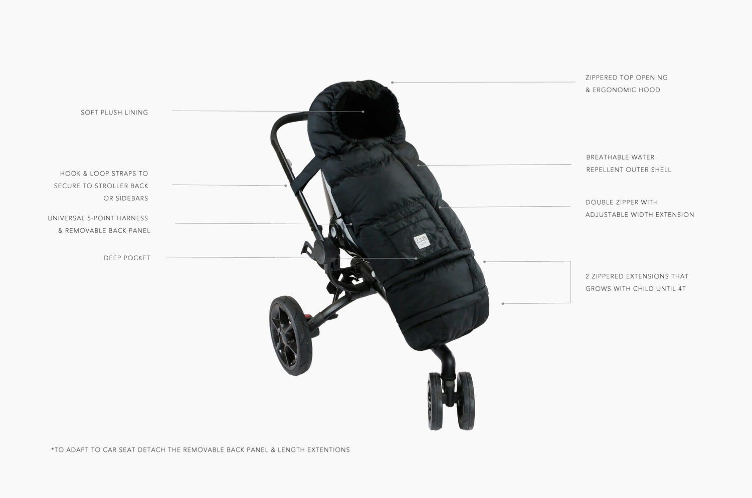 - Se adapta universalmente a todos los cochecitos y asientos de coche con sujeciones de gancho y bucle.