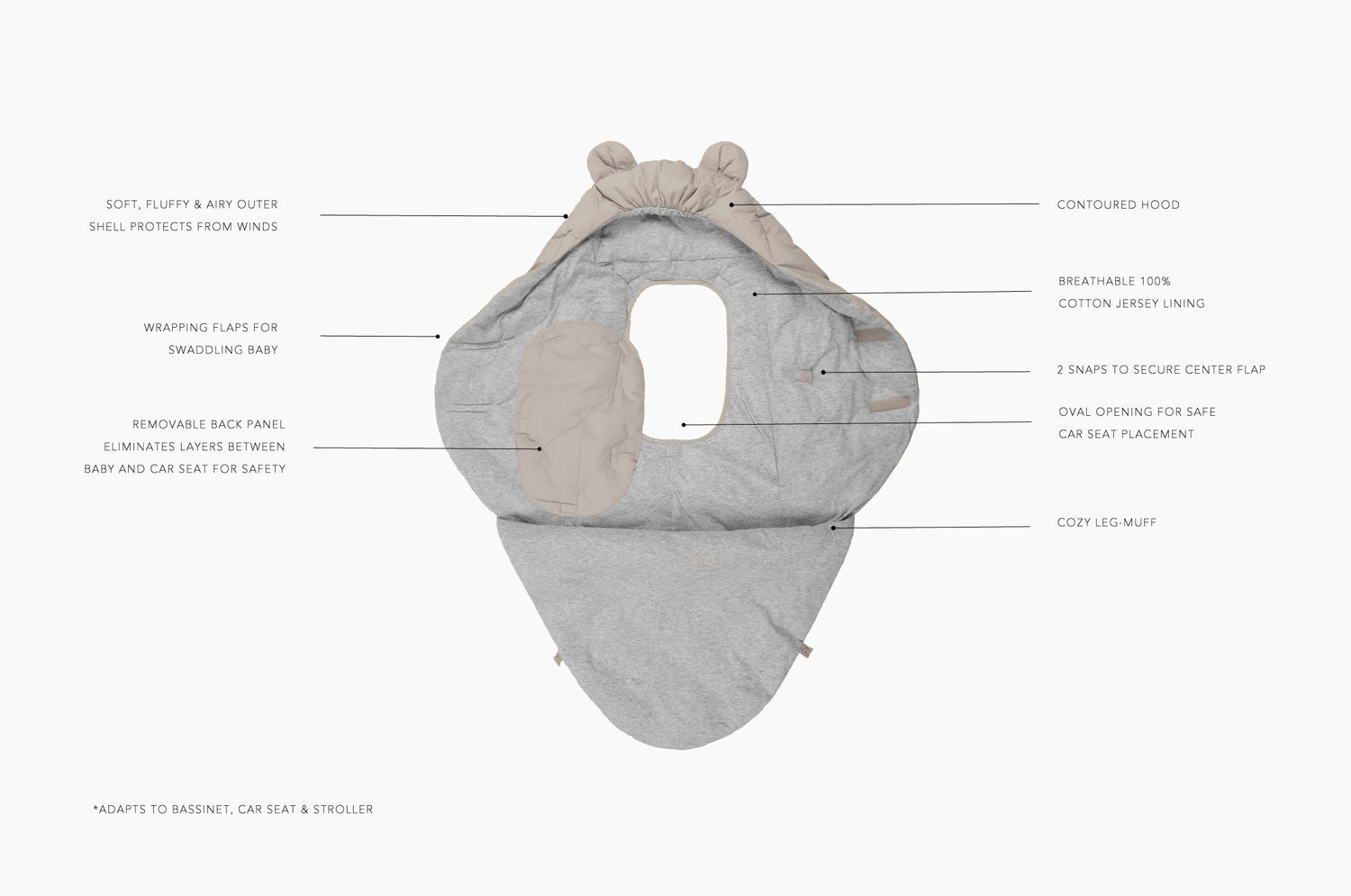 - Envoltura universal adaptable a todos los capazos, sillas de coche y cochecitos